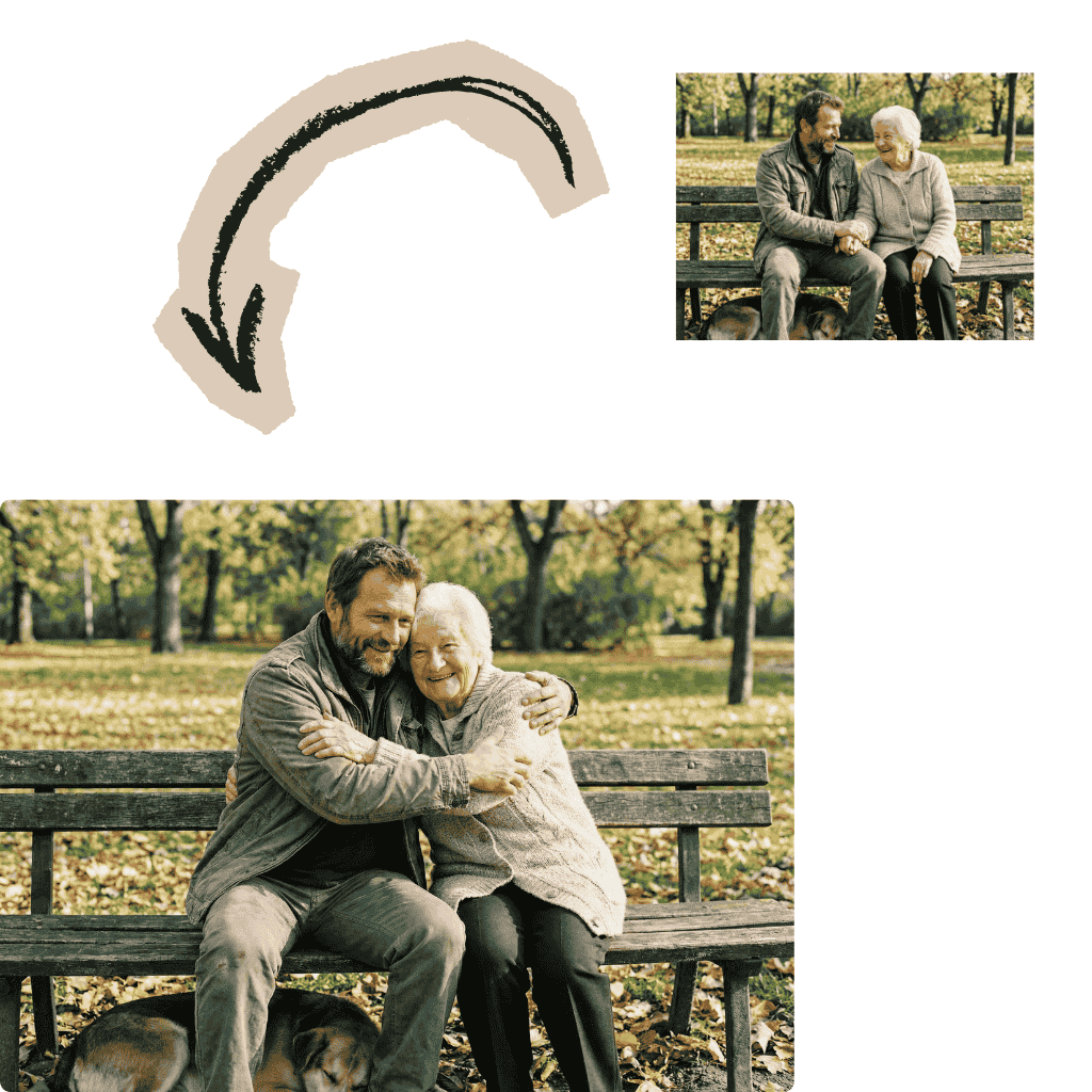 Want a special memory with your furry friend? Our advanced AI recognizes animals, allowing you to generate a heartwarming hug with your dog or cat.